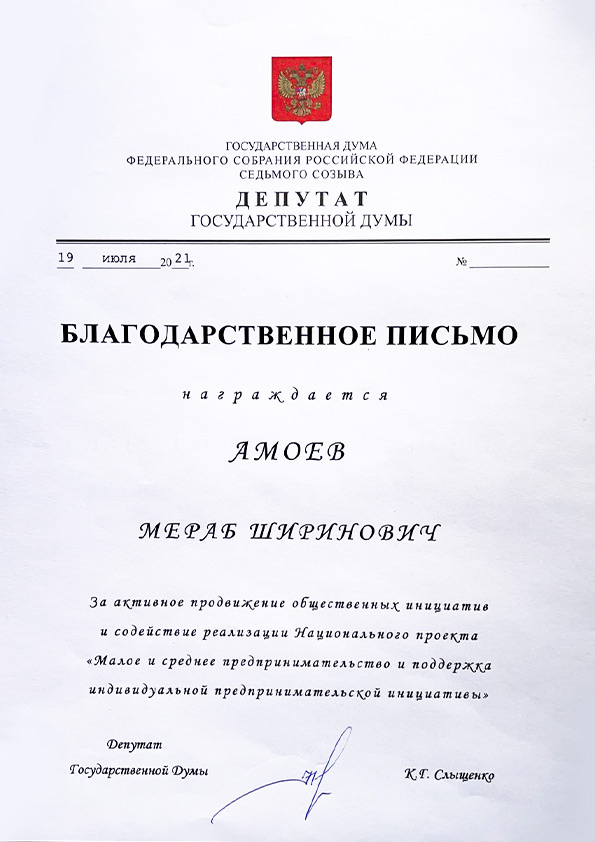 С ноября 2021 по июнь 2022 года проходил программу профессиональной переподготовки (530 часов) "Обеспечение Межпарламентского Сотрудничества" в Российской Академии Народного Хозяйства Государственной Службы при Президенте Российской Федерации города Москвы, по направлению 38.04.04 "Государственное и муниципальное управление" и защитил аттестационную работу на тему "Порядок формирования и организация работы палат Федеральонго Собрания РФ"