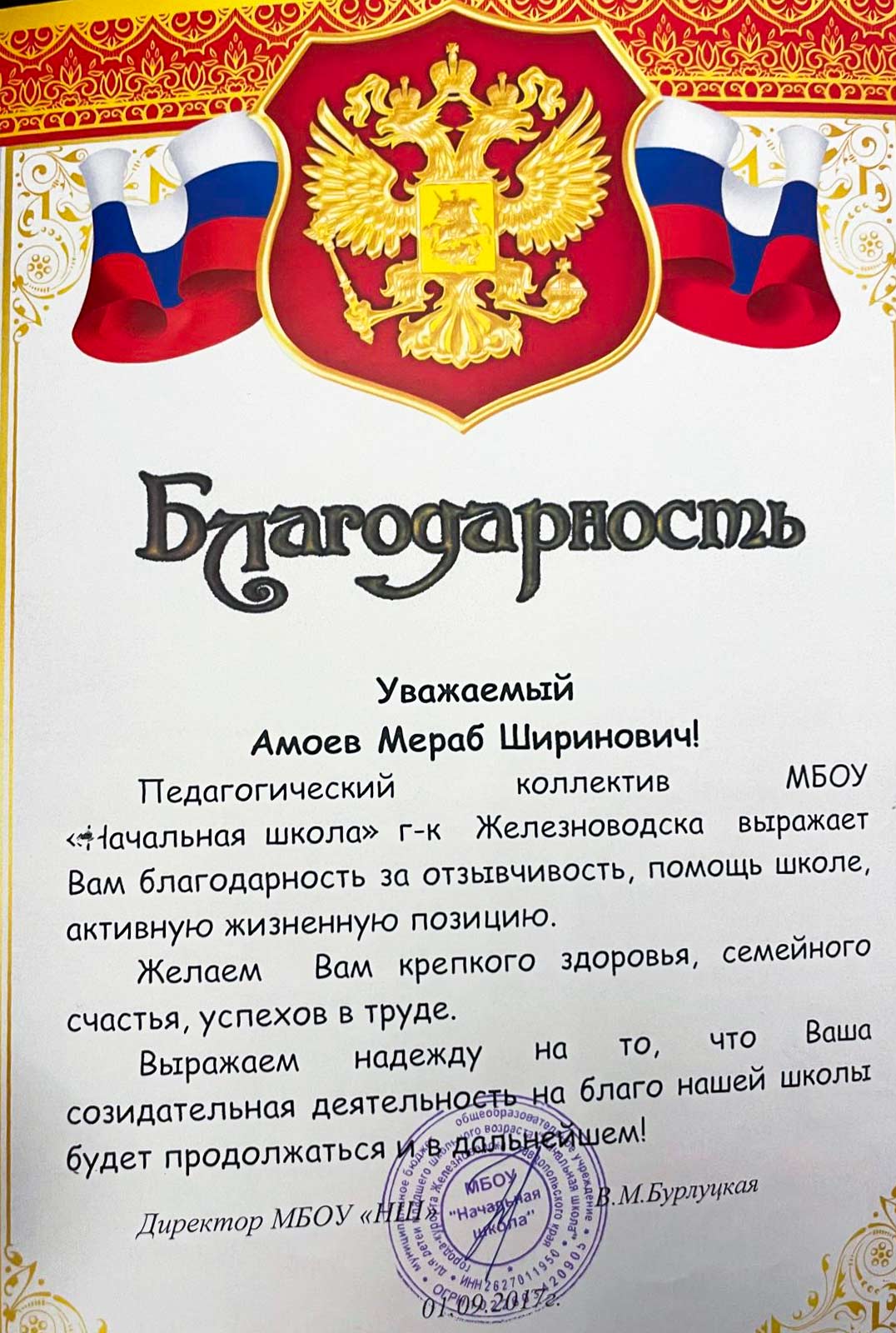 Благодарность за помощь школе МБОУ "Начальная школа"